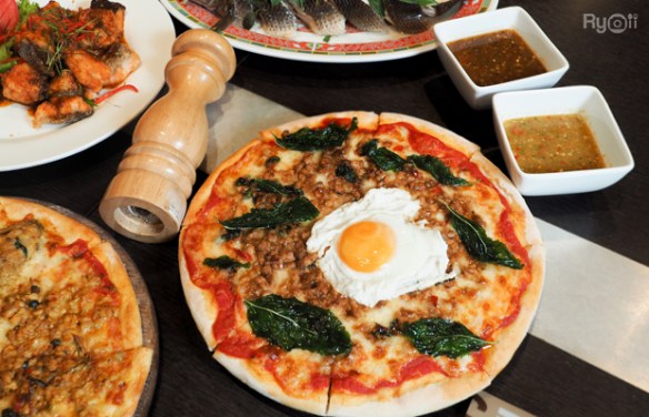 หากใครที่ชอบทานพิซซ่าอยู่แล้วแนะนำให้ลองสั่งเมนูพิซซ่าหน้ากะเพราไข่ดาวค่ะ เป็นเมนูที่ผสมผสานความเป็นอาหารไทยและอาหารอิตาเลียนเข้าด้วยกันอย่างลงตัว ซึ่งไซส์ที่เสิร์ฟมาจะเป็นพิซซ่าถาดเล็ก (8 นิ้ว) สามารถทานได้ 1-2 คน โดยจุดเด่นของพิซซ่าร้านนี้คือพิซซ่าแป้งบางกรอบ ให้หน้าพิซซ่าแบบเครื่องเยอะจุใจ สำหรับใครที่ยังไม่เคยลิ้มลอง ต้องลองสั่งดูค่ะ บอกเลยราคาเบาๆ น่ารักมาก