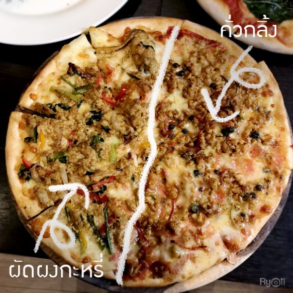 ต่อมาทางร้านได้เพิ่มความหลากหลายให้กับลูกค้าด้วยพิซซ่า 2 หน้าในถาดเดียว ซึ่งเป็นพิซซ่าหน้าคั่วกลิ้ง และผัดผงกะหรี่ซีฟู้ด โดยตอนที่พนักงานเดินมาเสิร์ฟได้กลิ่นหอมผงกะหรี่มาก ที่สำคัญทางร้านให้เครื่องเยอะแบบจุใจ ในส่วนคั่วกลิ้งจะเป็นคั่วกลิ้งหมูและผัดผงกะหรี่จะเป็นซีฟู้ด มีหอยแมลงภู่ ปลาหมึก พร้อมเครื่องเทศอีกมากมาย นอกเหนือจากนี้ยังมี พิซซ่าหน้าต้มยำกุ้ง และพิซซ่าหน้าขี้เมาทะเล ให้เลือกทานอีกด้วย ทีนี้ก็แล้วแต่เพื่อนๆ จะเลือกเลยค่าาาา
