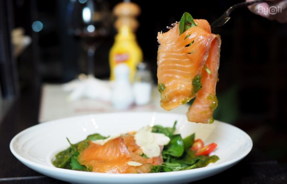 Smoke Norwegian Salmon Spicy Sauce (แซลมอนแซ่บ) : สำหรับใครที่ชอบเมนูแซ่บๆ แนะนำให้สั่งเมนูนี้เลย ทางร้านใช้เป็นแซลมอนรมควัน มีรสเค็มเล็กน้อย ตามด้วยกลิ่นหอมจากการรมควัน เมื่อคลุกเคล้าแซลมอนกับผักและน้ำยำ ทานร่วมกันน้ำยำมีรสชาติเปรี้ยวเผ็ดตัดกับความเค็มของแซลมอนเข้ากันได้ดี