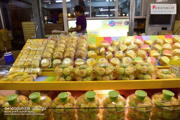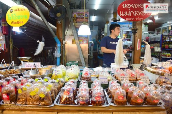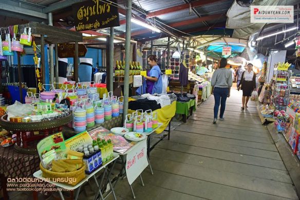 สินค้าที่ขายก็มีหลากหลาย ทั้งอาหารคาว ขนม ผลไม้ ผักสด ต้นไม้ เครื่องจักสาน และอื่นๆ อีกมากมาย อาหารคาว ก็ได้แก่ ปลาตะเพียน 3 รส น้ำพริกชนิดต่างๆ ห่อหมก..น้องหม่อน ปลาช่อนเผาเกลือ เป็ดพะโล้.นายหนับ กุนเชียงหมู ปลาสลิดตากแห้ง ปลาทูสามรส ขนม ที่ขึ้นชื่อก็มีหลายอย่าง เช่น สาลี่ทิพย์ โมจิ ปุยฝ้าย ขนมตาล..ป้าไข่ ขนมตะโก้ ขนมเบื้อง ขนมฝักบัวโบราณ ลูกชุบ ทองม้วนสด ข้าวเหนียวแก้ว ขนมเปี๊ยะเฮงกี่ บะจ่าง นอกจากนี้ยังมีผักและผลไม้ที่ส่งตรงมาจากสวนชาวบ้านให้เลือกซื้อกันอีก บรรยากาศได้กลิ่นอายย้อนยุค ที่มีร้านค้าเรียงรายอยู่ตามแพและเรือนริมน้ำ พออิ่มท้องกันแล้ว ก็ต้องไปนั่งเรือล่องแม่น้ำท่าจีน ชมวิวสองฟากฝั่ง สัมผัสวิถีชีวิตชาวบ้านริมน้ำ ทำให้ได้เห็นบ้านทรงไทยหลายแบบ บางหลังเป็นอาคารไม้เก่าตั้งแต่สมัยรัชกาลที่ 6 ซึ่งหาชมได้น้อยเต็มทีในปัจจุบัน ถือเป็นอีกหนึ่งกิจกรรมที่ไม่ควรพลาดเมื่อมาเยือนตลาดดอนหวาย