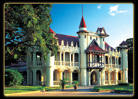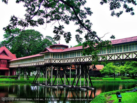 พระตำหนักมารีราชรัตบัลลังก์ เรือนไม้ตะวันตก 2 ชั้น สีแดง ชั้น 2 มีทางเดินทางเชื่อมไปพระที่นั่งชาลีมงคลอาสน์