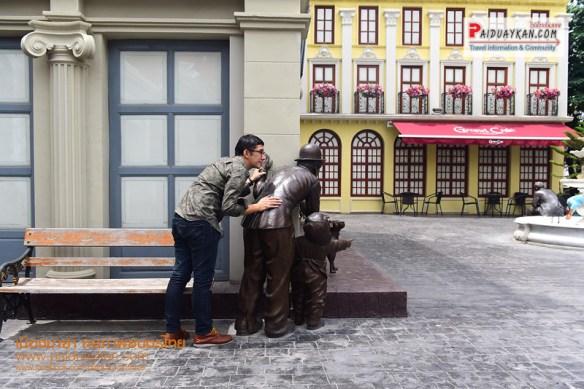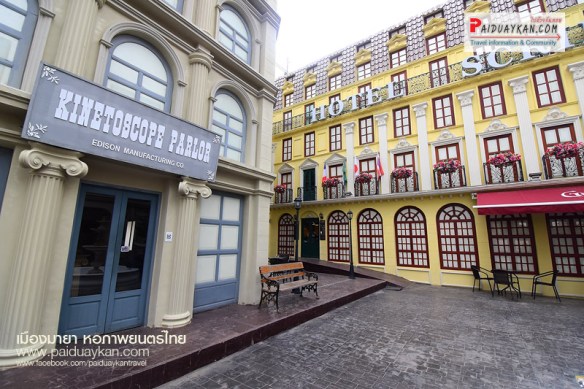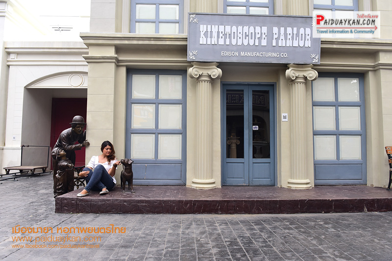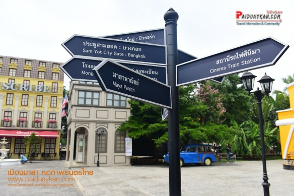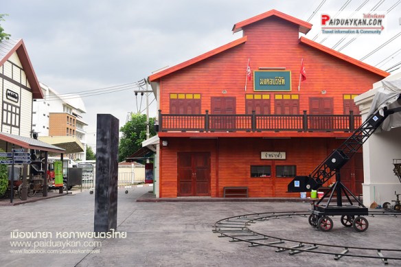 อาคารไม้สีแดง ตั้งอยู่ด้านหน้าเมืองมายา จำลองเป็น มายาพาณิชย์ เป็นที่ติดต่อสอบถามข้อมูล ลงทะเบียนเข้าเยี่ยมชมสถานที่ และ ขายสินค้าที่ระลึก จำลองอุปกรณ์การถ่ายหนัง แท่งโลหะสีดำที่ตั้งอยู่ตรงกลางลานเมืองมายา คือ ประติมากรรม ช่วง-เชิด ที่สร้างสรรค์โดยศิลปินแห่งชาติ “ช่วง มูลพินิจ” เพื่อรำลึกถึง “เชิด ทรงศรี” ผู้กำกับภาพยนตร์คนสำคัญของไทย และถ้ามองผ่านรู ตรงกลางของแท่งโลหะสีดำนี้ จะเห็นภาพกลับหัวของพิพิธภัณฑ์ภาพยนตร์ไทย ซึ่งเป็นหลักการเดียวกันกับการถ่ายภาพ ผ่านกล้องรูเข็ม ประตูสามยอดบนถนนเจริญกรุง ซึ่งเป็นบริเวณที่ตั้งของโรงละครหม่อมเจ้าอลังการ สถานที่ฉายภาพยนตร์แห่งแรก ของไทย เมื่อวันที่ 10 มิถุนายน 2440 ตรงข้ามกันคือ ฉากตึกสไตล์ยุโรป เป็นโรงแรม HOTEL SCRIBE และ ที่มุมตึกมีรูปหล่อ จำลองผู้ชายและเด็กชาย ยืนซุ่มแอบนายตำรวจอยู่มุมตึก ที่แสดงในภาพยนตร์เรื่อง “THE KID” หรือ “เจ้าหนู” (2464) หนังเงียบ อเมริกันคลาสสิก ที่นำแสดงโดย ชาร์ลีส์ แชปลิน นักแสดงตลกที่โด่งดัง แล แจ็กกี้ คูแกน นักแสดงเด็กที่ดังที่สุดคนหนึ่งของโลก